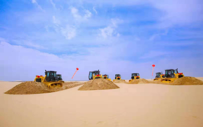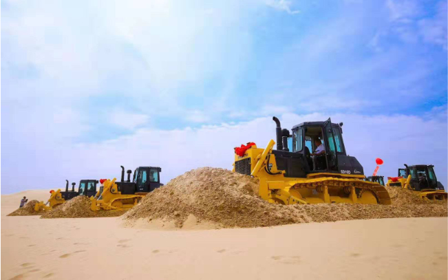 SD16D推土机,助力国家沙漠治理、光伏项目的建设。沙漠地区温度高,风沙粉尘大对推土机进气系统,冷却系统,驾驶室密封有严格的要求,SD16D推土机针对沙漠地区恶劣工况,定制化开发,由于超高的出勤率,超低的维护保养成本,赢得了用户的充分认可,为沙漠经济先导区的建设保驾护航。