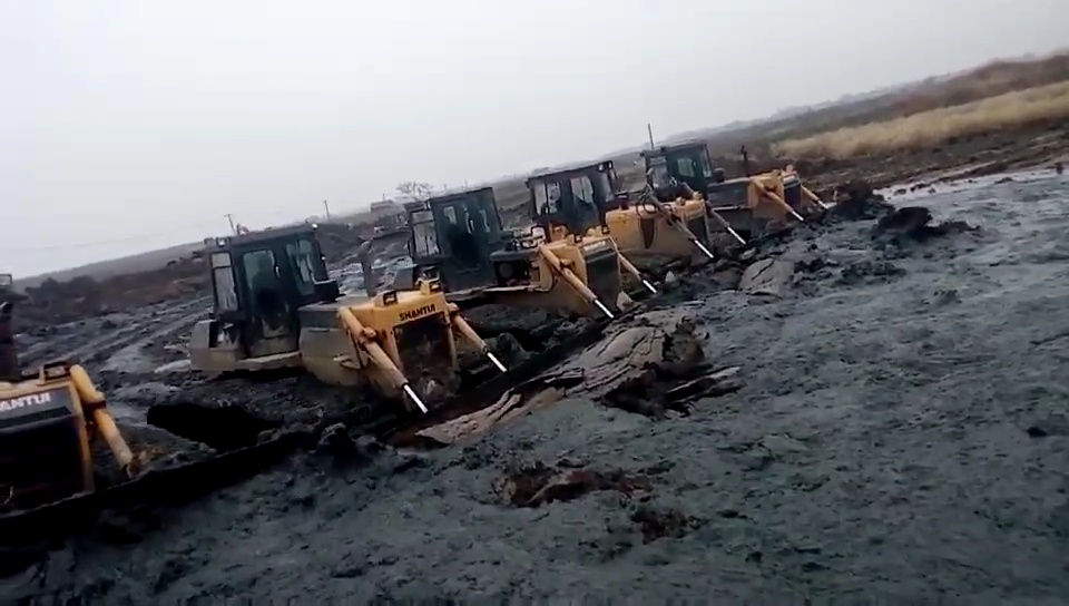 技巧五:在泥泞松软的工况推土时,推土机容易陷车,所以每铲推土量不可过大,行驶途中尽量避免停歇、换挡、转向和制动,必要时用2挡推土。如果遇到履带打滑的情况,可适当提升铲刀减少推土量,若推土机仍不能前进,则可挂倒挡后退。