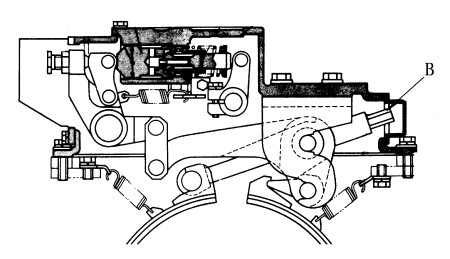 3)制动带抱紧制动鼓后,再将螺母(B)拧松1-5/6圈,使制动鼓与制动带间的间隙0.3mm。相应地,制动踏板的行程为90-110mm。