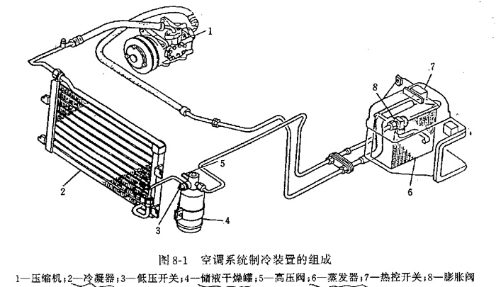 1-电磁离合器及压缩机2-冷凝器3-低压开关4-储液干燥器5-高压阀6-蒸发器7-热控开关8-膨胀阀