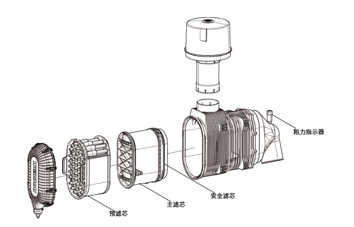 当进气阻力指示器报警(变红)时,需保养空滤器主滤芯(注意:安全滤芯禁止